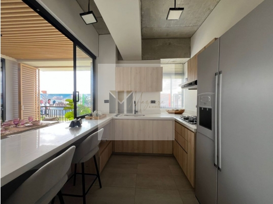 - Sala, comedor, cocina equipada con estufa y campana.